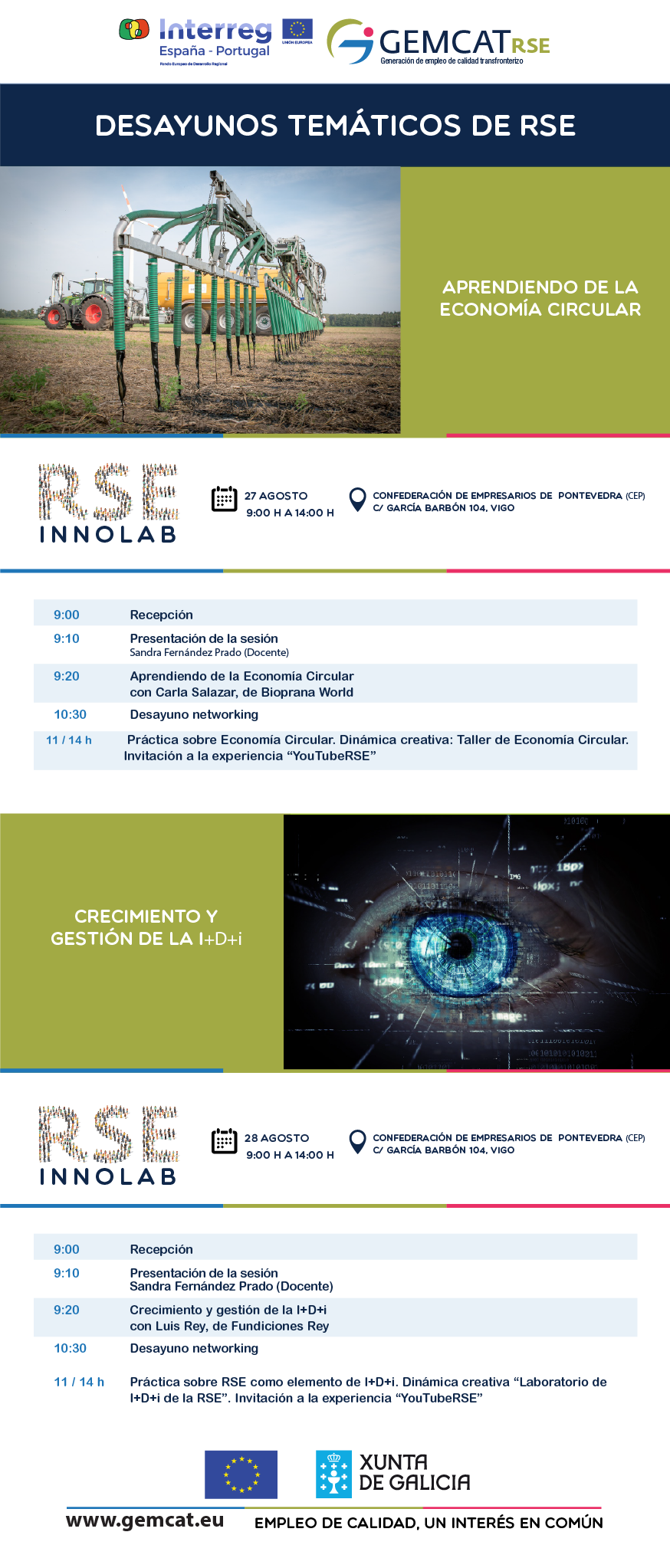 El mes de agosto finaliza en la oficina RSE Innolab de Vigo con dos nuevas citas importantes. La primera es el desayuno temático Aprendiendo de la Economía Circular, que se celebra el martes, 27 de agosto. Ese día tendrás ocasión de adquirir nuevos conocimientos con